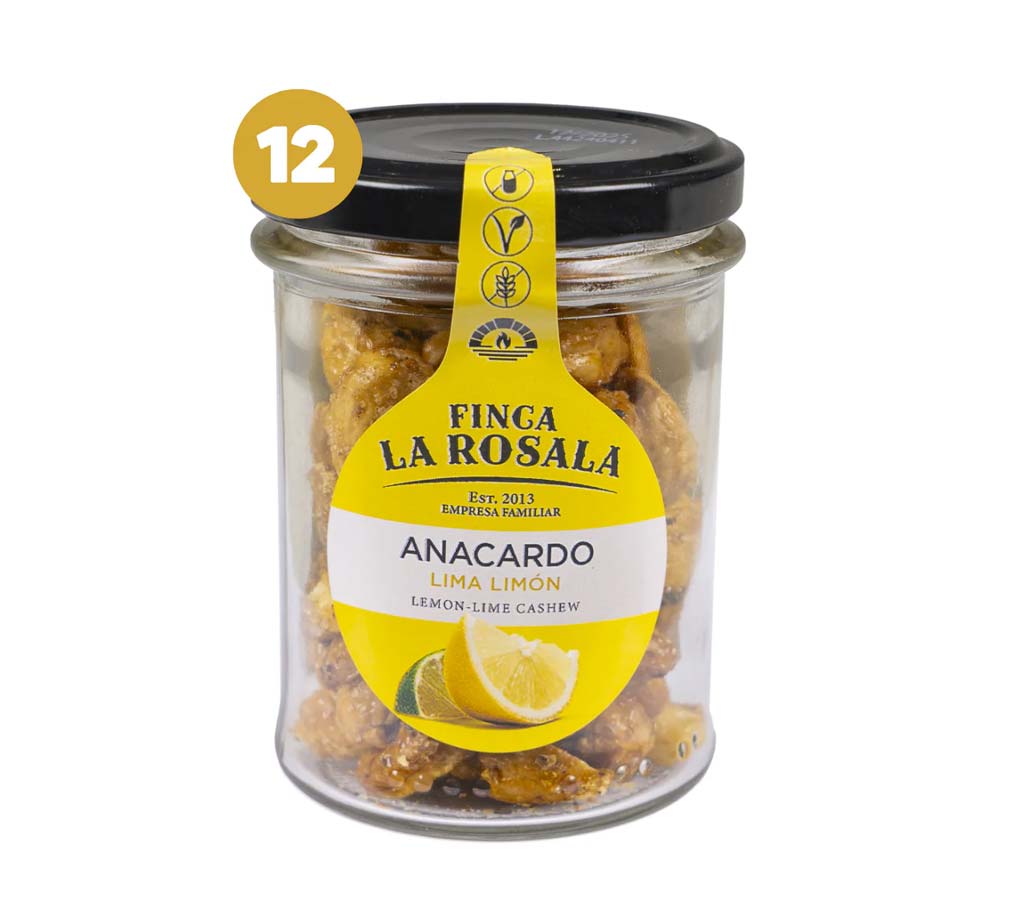 Noix de cajou grillées artisanalement avec un mélange spécial de sucre de canne complet écologique, des copeaux lyophilisés de citron vert et citron biologiques et de l’arôme naturel de citron vert et citron.
